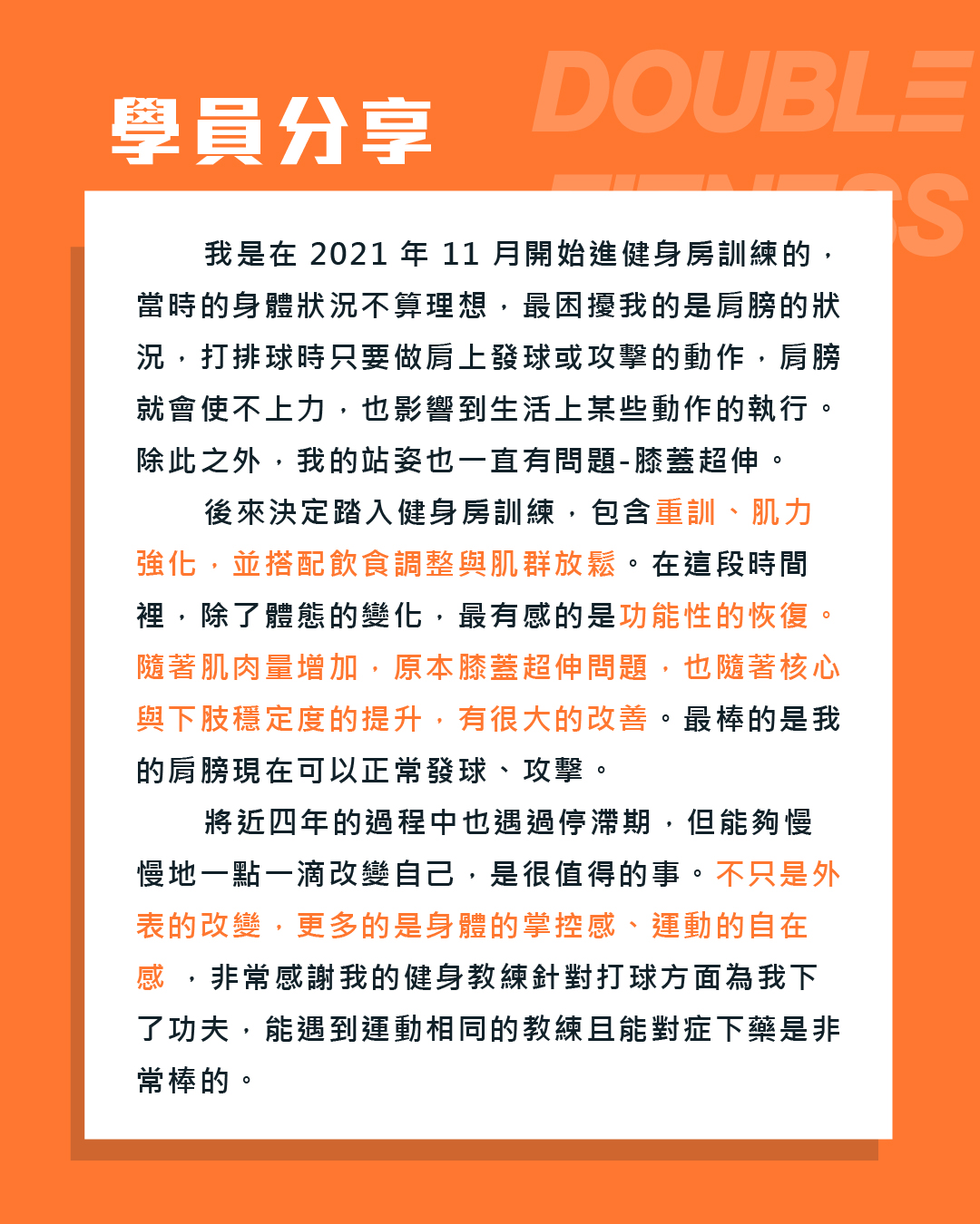 學員一開始被高內臟脂肪、打球肩膀痛、還有膝蓋超伸困擾著,